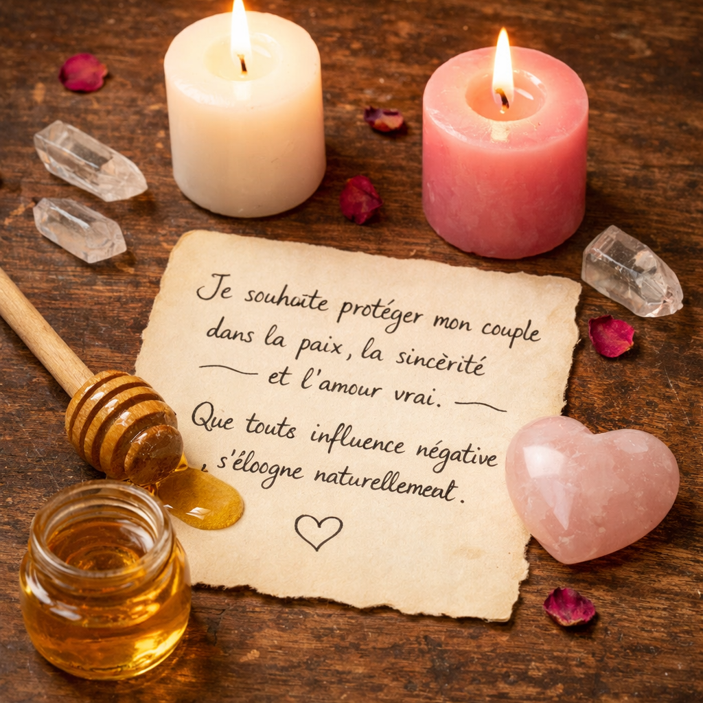 Enfin, la dimension spirituelle joue un rôle central. Une prière ou un rituel bienveillant agit avant tout sur ton état intérieur et ton énergie. Par exemple, répéter une intention telle que : « Que mon couple soit protégé dans la vérité, la paix et l’amour sincère » crée un environnement émotionnel favorable et attire des énergies harmonieuses. Quand ton esprit est calme, centré et confiant, ton comportement devient naturellement plus positif, ce qui contribue à éloigner toute influence négative sans confrontation ni conflit. Ainsi, protéger son couple de manière saine repose sur l’alliance entre renforcement du lien, travail sur soi et intention spirituelle.